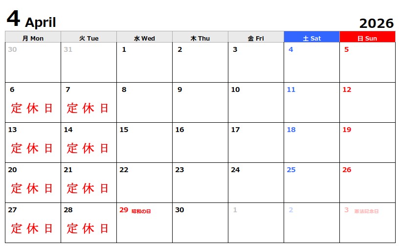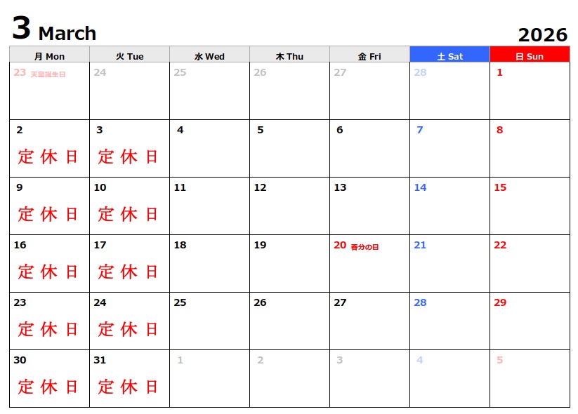 定休日 月曜日 火曜日